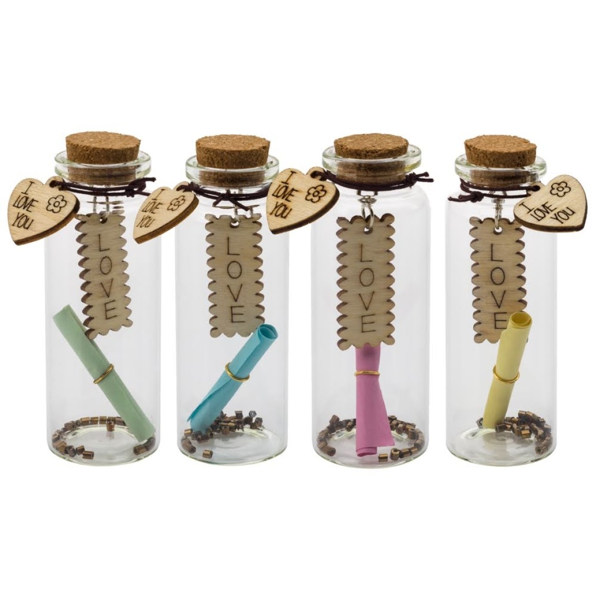 Linda garrafinha de vidro com tampa de rolha, Tag coração MDF I Love You , pingente MDF interno Love, vidrilhos decorativos + papel em forma de rolo para você escrever uma mensagem especial e presentear.