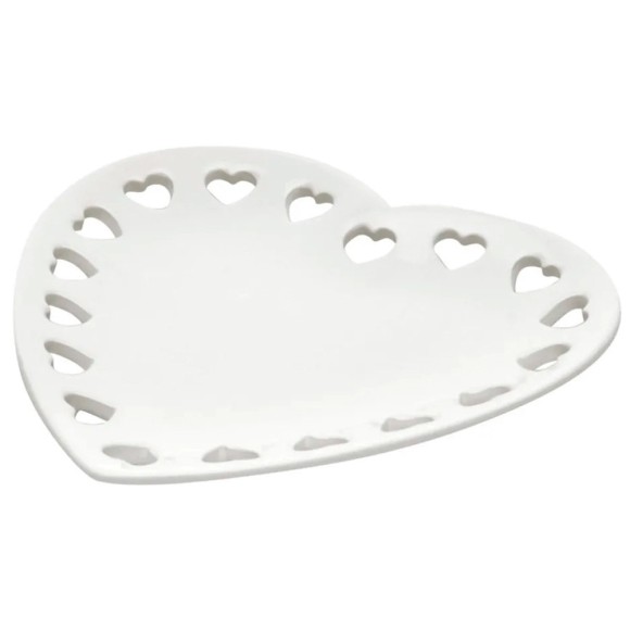 Pode ser usado como centro de mesa portando objetos, ou, porta anéis. O produto é produzido em cerâmica branca com alto brilho e excelente acabamento. Possui design no formato e detalhes vazados de coração. Lindo para uma decoração fina, romântica e moderna.