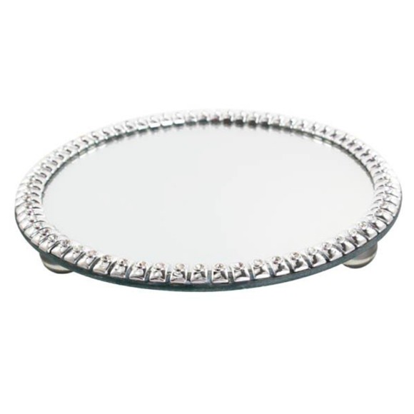 A Bandeja Fashion Redonda Prata Com Espelho Grande apresenta detalhes na borda como retangulos em prata com aplicação de strass; em baixo da bandeja há 3 bases circulares espelhadas que comportam os pés de esferas de vidro.