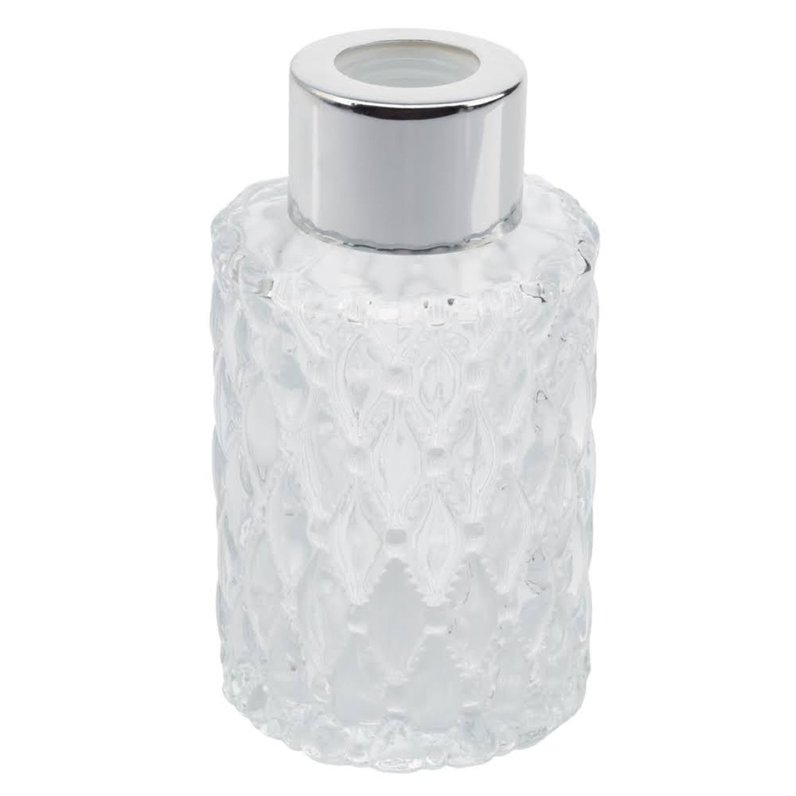 Frasco de vidro Com Tampa Prata para aromatizador, 80ml. Detalhes no corpo do frasco de losango e bolinha.